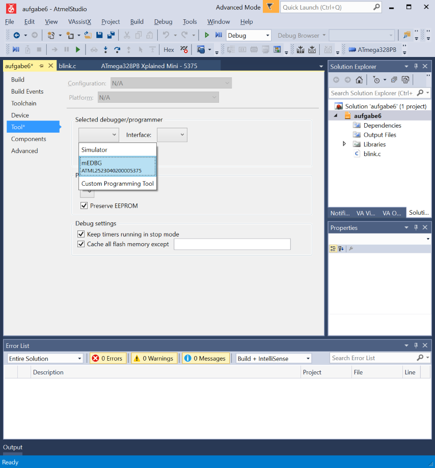 blink.c) rechts im Solution Explorer direkt unter den Projektknoten (z. B.aufgabe0). Dann nochmal neu kompilieren.
