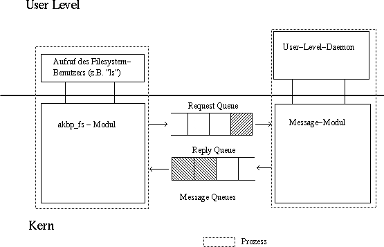 Greift der Benutzer in einem Prozess (linker Kasten) auf das Dateisystem mit einem der üblichen Datei-Operationen (lookup(), readdir(), open(), ...) zu, so hängt das akbp_fs - Modul eine entsprechende Nachricht in die Request-Queue und wartet auf die Antwort.