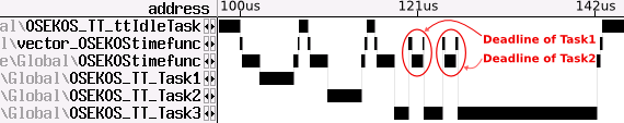 Comparing the execution traces of Sloth on Time and a commercial OSEKtime implementation reveals how our system behaves better in terms of schedulability of the application and predictability of execution times, since unnecessary deadline check interrupts are avoided: