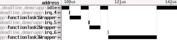 The approach to deadline monitoring in Sloth on Time also benefits from the individual assignment of timing actions to timer cells. Unlike traditional systems, which interrupt the current control flow when a deadline expires in order to verify that it has been met, Sloth on Time avoids such unnecessary interruptions by simply enabling the timer cell assigned to a deadline only as long the monitored task is actually running. This deals a slight increase in overhead on task termination, but eliminates the undesired scenario of preempting a high-priority task on behalf of a low-priority task for a deadline violation check.