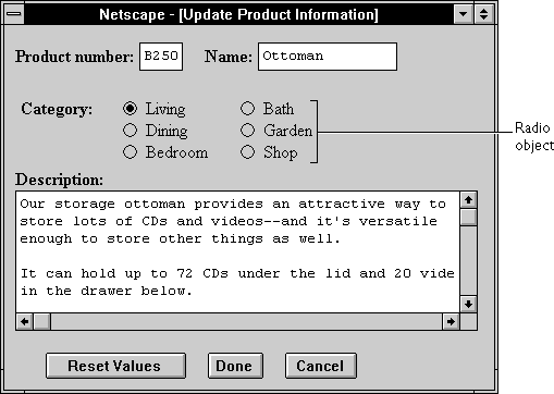 <INPUT TYPE="text" NAME="catalog" SIZE="20">Example 2. The following example contains a form with three text boxes and three radio buttons. The radio buttons let the user choose whether the text fields are converted to uppercase or lowercase, or not converted at all. Each text field has an